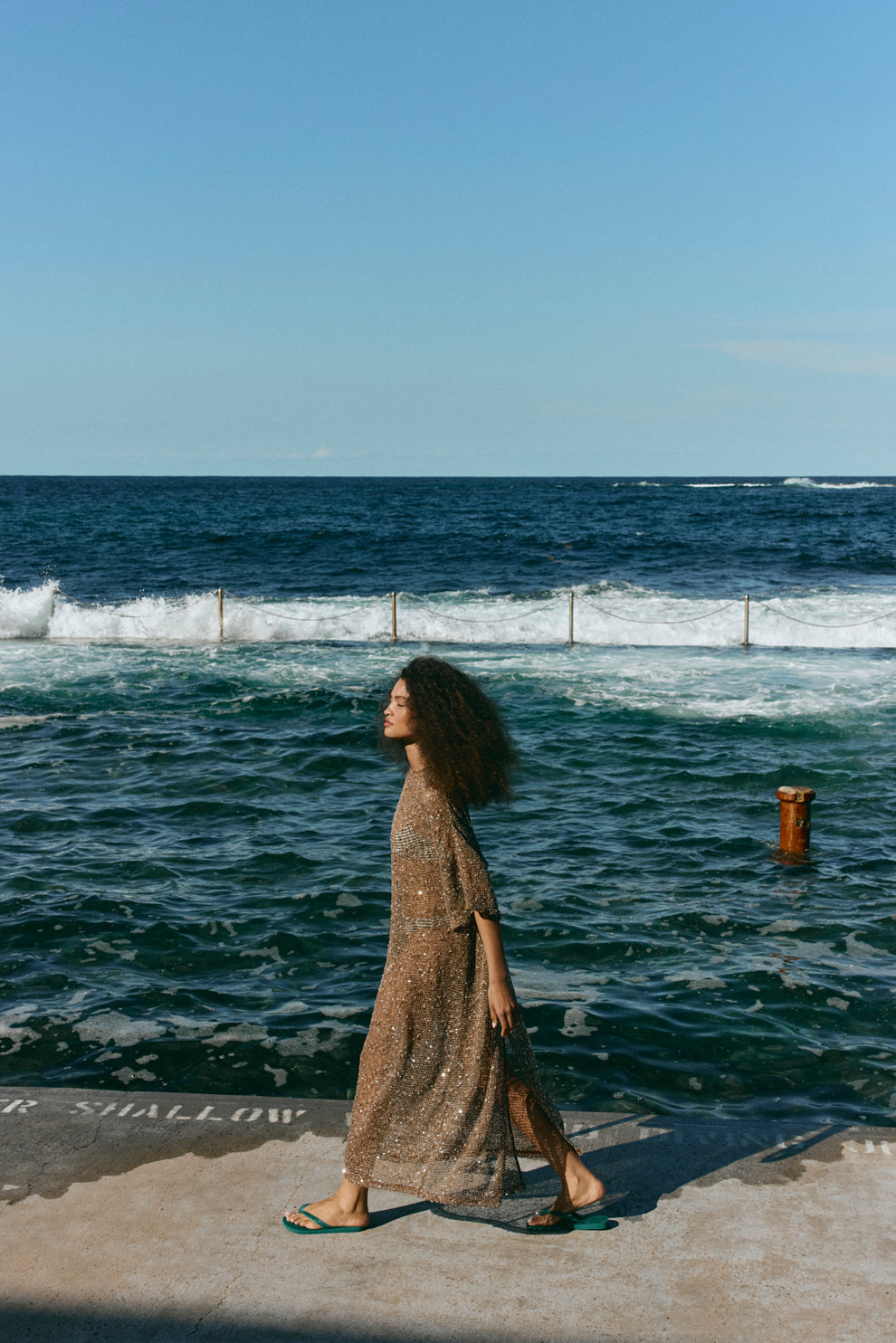 The Midi Dress is made from a sheer mocha knit scattered with sequins that shift and catch the light. Designed oversized with a relaxed fall, it features a centre back shell button closure and a back split for movement. Wear it layered or let it stand alone - a statement that speaks for itself.
